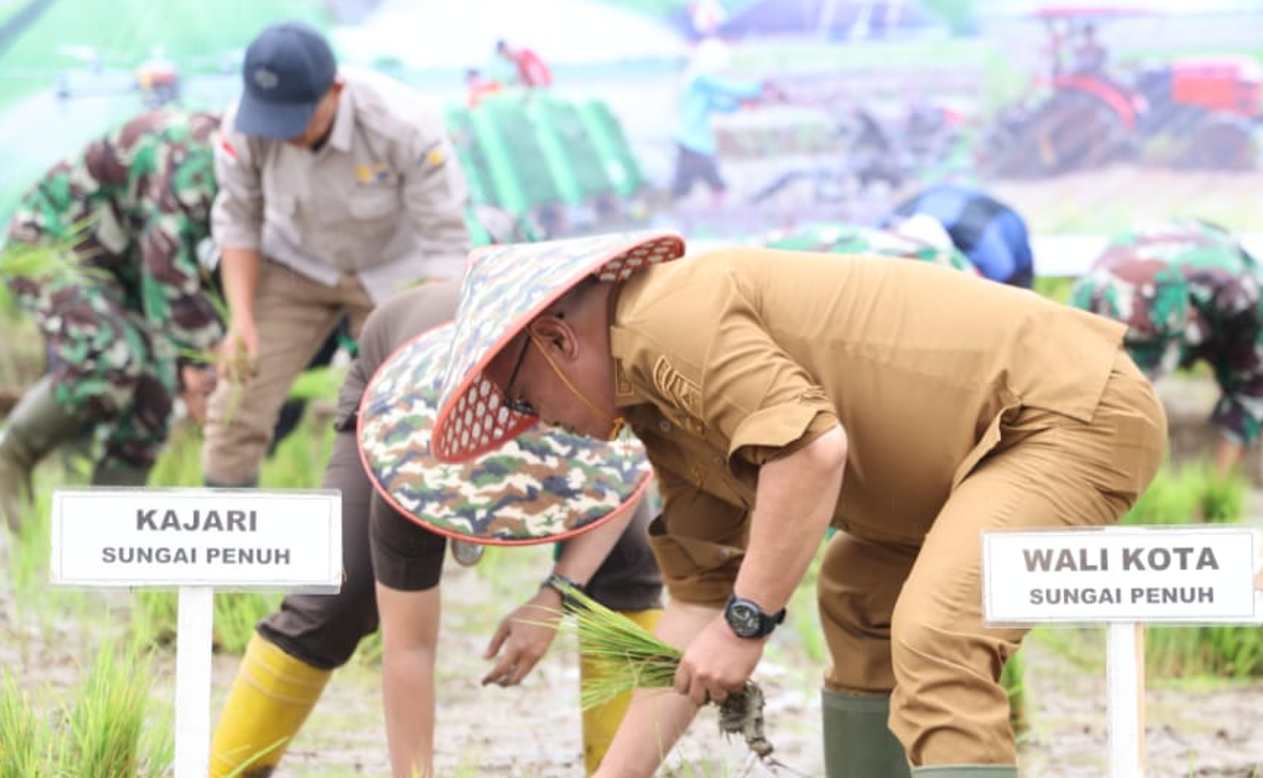Walikota Sungai Penuh, Alfin, melakukan penanaman padi pada Gerakan Serempak Percepatan Tanam Menuju Swasembada Pangan Provinsi Jambi.-Ist/Jambi Independent-Jambi Independent