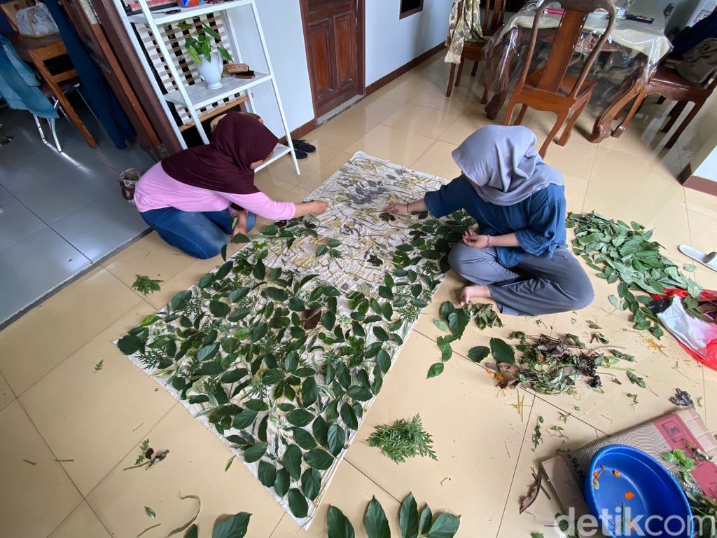 Kemudian kain dihias dengan berbagai daun atau bunga. Sebenarnya, daun apapun bisa dipakai, tapi Nuning menyerankanpilih daun dengan kandungan tanin yang kuat seperti daun truja dan daun lanang.
