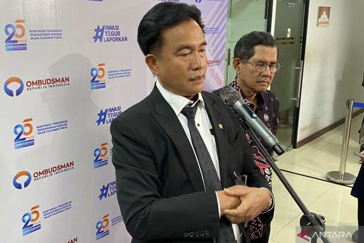 DANA PARPOL: Menteri Koordinator Bidang Hukum, HAM, Imigrasi, dan Pemasyarakatan Yusril Ihza Mahendra menjawab pertanyaan wartawan di Jakarta.-ANTARA FOTO-Jambi Independent