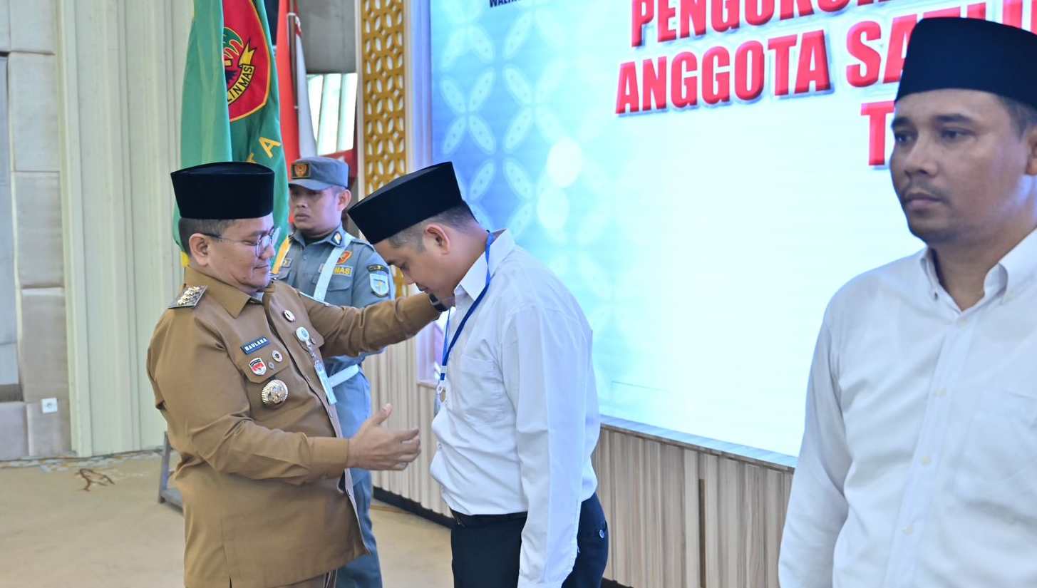 Pengukuhan ditandai dengan pembacaan sumpah/janji anggota secara simbolis, serta penyematan atribut Satlinmas oleh Wali Kota Jambi, Dr dr H Maulana, MKM., didampingi Wakil Wali Kota, Diza Hazra Aljosha, SE, MA.