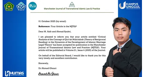 Artikel berjudul “Critical Analysis of the Concept of Qirā’ah Mubādalah (Theory of Reciprocal Reading) in the Dynamics of the Development of Islamic Marriage Legal Theory” diterima di Manchester Journal of Transnational Islamic Law & Practice, sebuah jurnal ilmiah kategori Q2 yang terbit di Inggris.