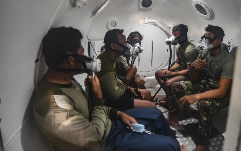 Prajurit Batalyon Intai Amfibi-1 Korps Marinir TNI AL (Yontaifib-1) duduk di dalam ruangan dekompresi (chamber decompression) milik Yontaifib-1 usai melakukan penyelaman dalam operasi SAR pesawat Sriwijaya Air PK-CLC nomor penerbangan SJ 182 di Pantai Ta-ANTARA FOTO/Muhammad Adimaja/wsj.-