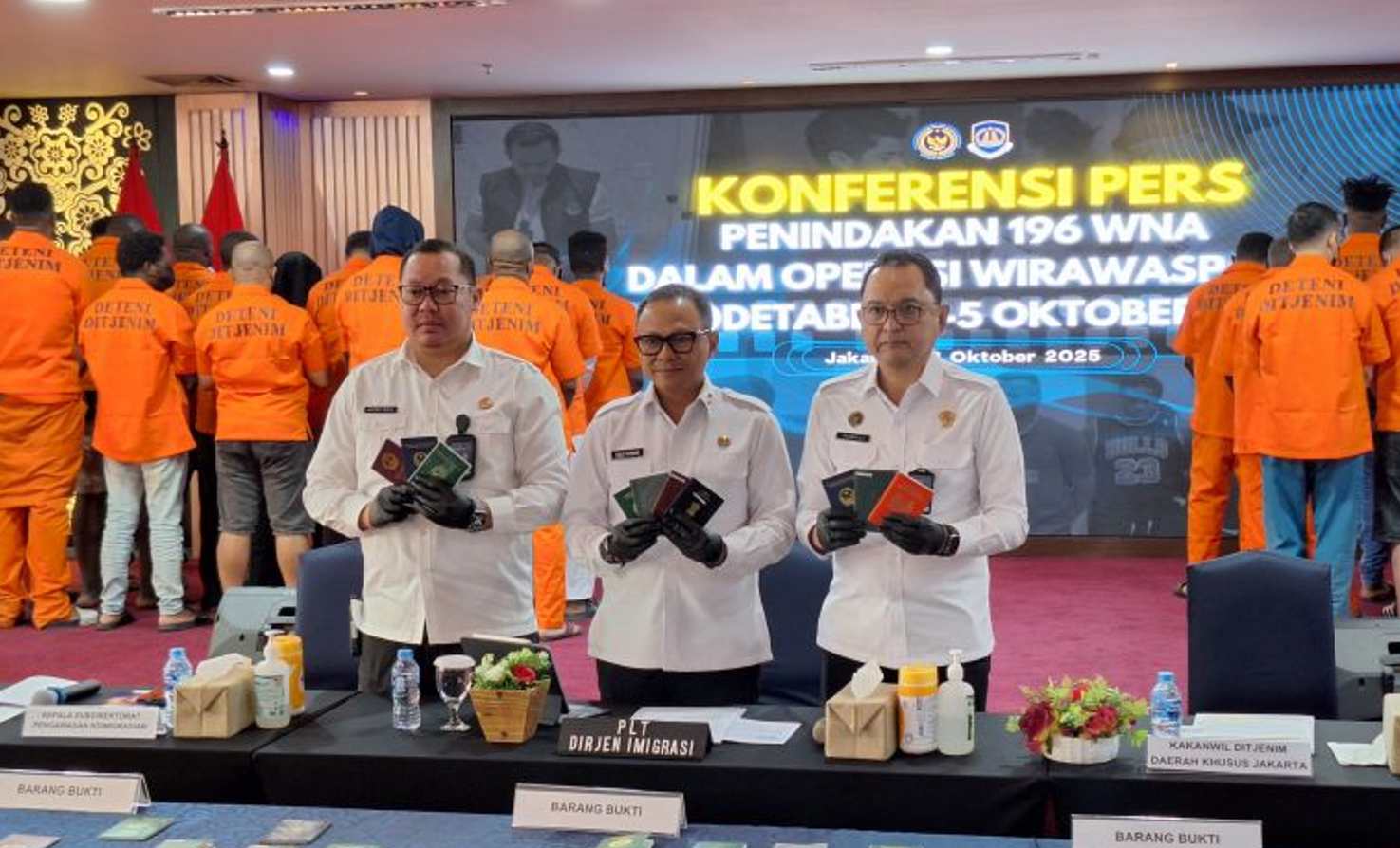 Plt. Dirjen Imigrasi Yuldi Yusman (tengah) memperlihatkan barang bukti penangkapan 196 orang warga negara asing (WNA) di Kantor Kementerian Imipas.-Ist/Jambi Independent-Jambi Independent