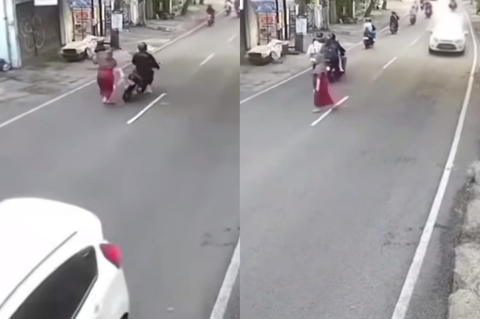 Pengendara motor yang melaju di belakangnya kaget dan berusaha menghindar dengan membanting setir ke kanan.