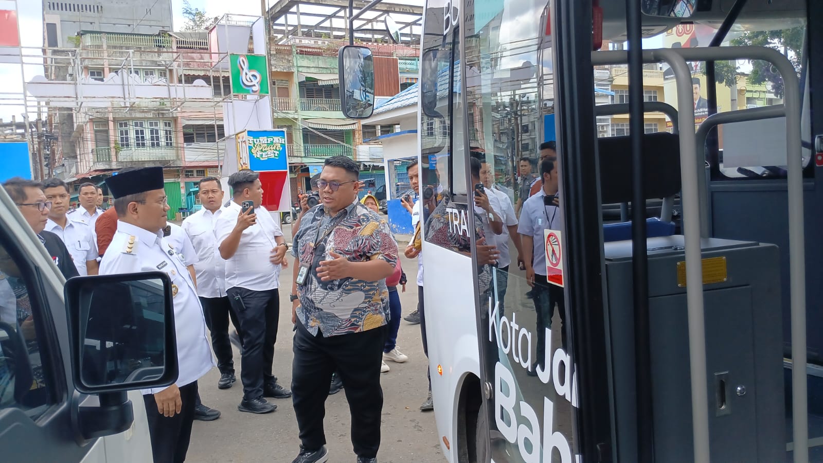 Wali Kota Jambi, Maulana saat meninjau kondisi bus listrik-Rizal Zebua-