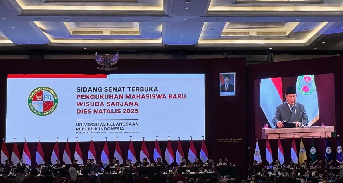Hal itu disampaikan Presiden saat menyampaikan orasi ilmiah dalam Wisuda Universitas Kebangsaan Republik Indonesia (UKRI) di Bandung, Jawa Barat, pada Sabtu (18/10/2025).