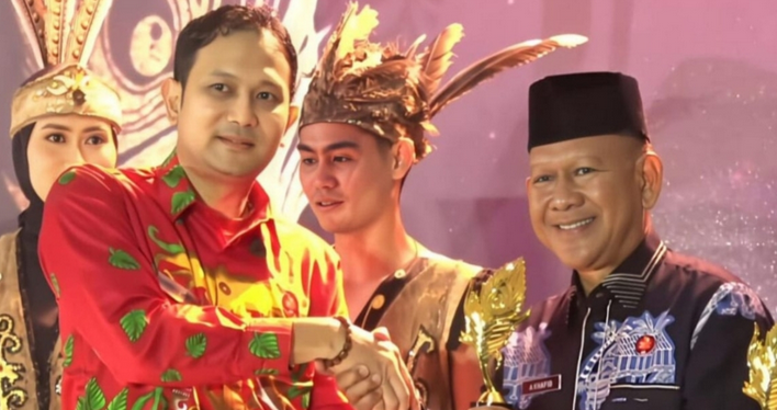 Piala penghargaan diterima Wakil Bupati Merangin, H A Khafid, didampingi Wakil Ketua TP PKK Merangin, Hj Minarsih Khafid, pada malam puncak API Awards 2025 di Kabupaten Bengkayang, Kalimantan Barat.