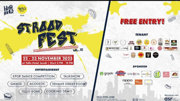JAMBI,JAMBIKORAN.COM — Setelah sukses pada penyelenggaraan pertama, Yello Hotel Jambi kembali menghadirkan Strood Fest Vol 2. Sebuah gelaran festival kuliner dan kompetisi tari yang berlangsung selama dua hari pada 22–23 November 2025, mulai pukul 15.00 – 22.00 WIB di area Yello Hotel Jambi.